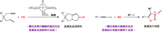 私の研究グループでは、これらの有害ガスを有機分子中に取り込み(ガス固定反応)、人の健康や福祉に有用な物質に変換するような新反応の開発を目的に研究を行っています。